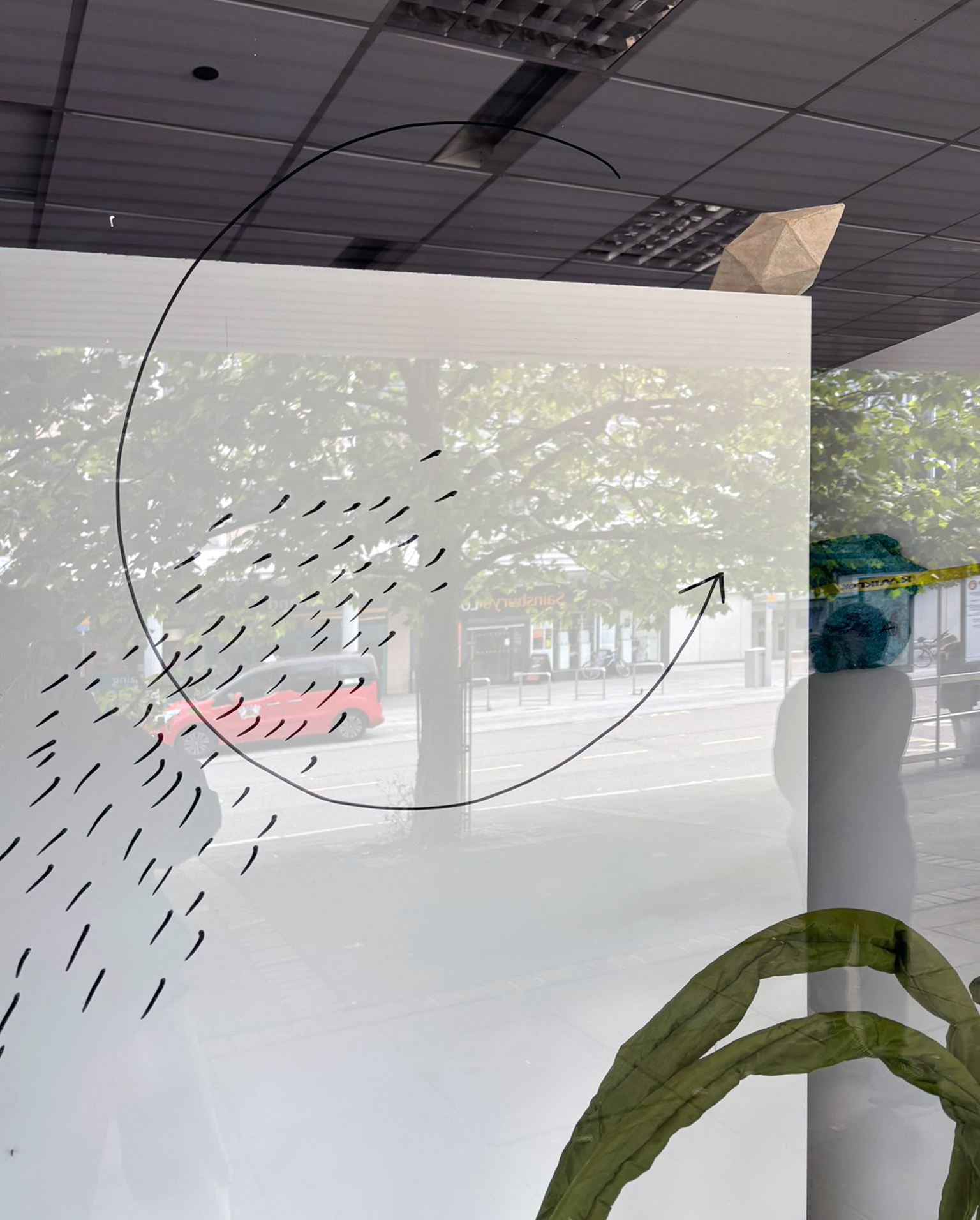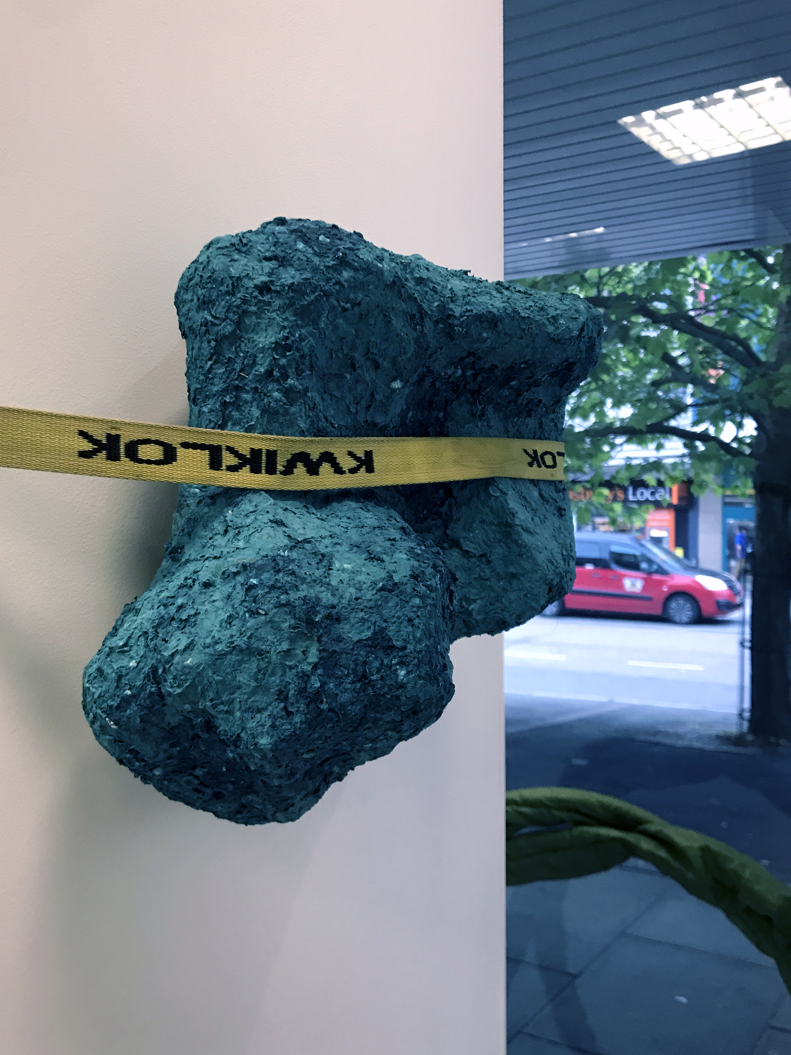 Works by the three of us were squished, folded and bound together. Forming a window project install.